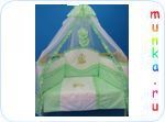 Комплект 7 предметов: балдахин - сетка 1,8м4,5м, охранный бампер 4м0,40м, одеяло 1,45м1,10м, пододеяльник 1,45м1,10м, наволочка 0,60м*0,40м, подушка, простыня на резинке. Ткань - супер-коттон (нежный хлопок), наполнитель холофайбер None