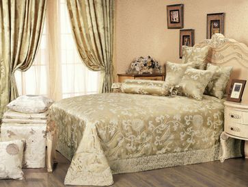 Богатая, фактурная ткань штор, сочетающая благородный глянец горчично-золотистого фона и матовость изящных завитков украсит буквально любую спальню, внеся в неё атмосферу тепла и уюта. Ткань средней плотности станет прекрасным защитой от солнца. Для завершения образа предлагается покрывало, выполненное в том же дизайне.