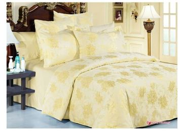 Постельное белье сделано из жаккарда - ткани фактурного плетения, в которой нити очень плотно переплетены и образуют узорчатый релье. При таком плетении достигается очень высокая плотность нитей на единицу площади, поэтому всякий жаккард заведомо долговечнее любого другого материала, полученного одним из простых способов плетения. Петли перекручены, при растяжке не распускаются. Благодаря этому ткань жесткая, прочная, но не тяжелая, менее подвержена истиранию. Жаккард очень практичный материал, неприхотливый в уходе.