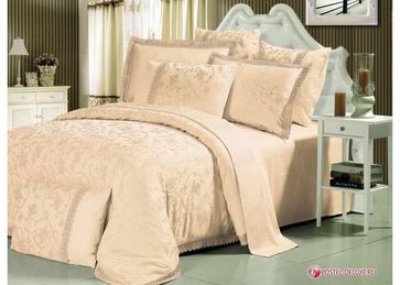 Постельное белье сделано из жаккарда - ткани фактурного плетения, в которой нити очень плотно переплетены и образуют узорчатый релье. При таком плетении достигается очень высокая плотность нитей на единицу площади, поэтому всякий жаккард заведомо долговечнее любого другого материала, полученного одним из простых способов плетения. Петли перекручены, при растяжке не распускаются. Благодаря этому ткань жесткая, прочная, но не тяжелая, менее подвержена истиранию. Жаккард очень практичный материал, неприхотливый в уходе.