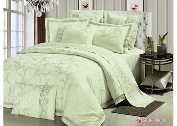 Постельное белье сделано из жаккарда - ткани фактурного плетения, в которой нити очень плотно переплетены и образуют узорчатый релье. При таком плетении достигается очень высокая плотность нитей на единицу площади, поэтому всякий жаккард заведомо долговечнее любого другого материала, полученного одним из простых способов плетения. Петли перекручены, при растяжке не распускаются. Благодаря этому ткань жесткая, прочная, но не тяжелая, менее подвержена истиранию. Жаккард очень практичный материал, неприхотливый в уходе.