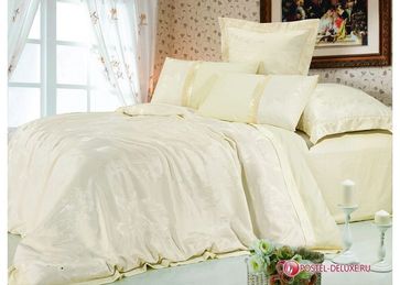 Постельное белье сделано из жаккарда - ткани фактурного плетения, в которой нити очень плотно переплетены и образуют узорчатый релье. При таком плетении достигается очень высокая плотность нитей на единицу площади, поэтому всякий жаккард заведомо долговечнее любого другого материала, полученного одним из простых способов плетения. Народное название жаккарда – искусственный шелк. Петли перекручены, при растяжке не распускаются. Благодаря этому ткань жесткая, прочная, но не тяжелая, менее подвержена истиранию. Жаккард очень практичный материал, неприхотливый в уходе.