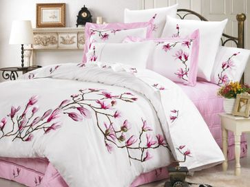 Романтический и ценный подарок для тех, кто любит весеннее время – время обновления, пышного цветения и ярких красок! На белоснежном поле распускаются роскошные цветы магнолии, знаменитые опьяняющим ароматом и тонкой, величественной красотой. Утонченная многоцветная вышивка-сеточка делает цветы объёмными, а нежно-розовые декоративные ушки у наволочек дополняют романтический образ комплекта.