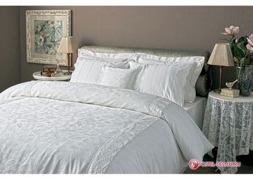 Постельное белье сделано из жаккарда - ткани фактурного плетения, в которой нити очень плотно переплетены и образуют узорчатый релье. При таком плетении достигается очень высокая плотность нитей на единицу площади, поэтому всякий жаккард заведомо долговечнее любого другого материала, полученного одним из простых способов плетения. Петли перекручены, при растяжке не распускаются. Благодаря этому ткань жесткая, прочная, но не тяжелая, менее подвержена истиранию. Жаккард очень практичный материал, неприхотливый в уходе.
