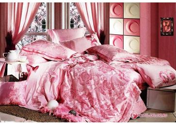 Постельное белье сделано из жаккарда - ткани фактурного плетения, в которой нити очень плотно переплетены и образуют узорчатый релье. При таком плетении достигается очень высокая плотность нитей на единицу площади, поэтому всякий жаккард заведомо долговечнее любого другого материала, полученного одним из простых способов плетения. Петли перекручены, при растяжке не распускаются. Благодаря этому ткань жесткая, прочная, но не тяжелая, менее подвержена истиранию. Жаккард очень практичный материал, неприхотливый в уходе.