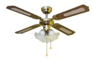 Люстра вентилятор Trio 105, диаметр- 105 см; применяется в бытовых помещениях различного назначения, чтобы обеспечить беззвучное охлаждение и рекуперацию теплого воздуха зимой. С помощью шнура-переключателя производится переключение скоростей между тремя возможными. Второй шнур-переключатель предназначен для включения/выключения световой части вентилятора, состоящей из светильника на 3 лампы E27. Мощность каждой лампы не должна превышать 60 Вт (указана мощность для ламп накаливания).
