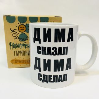 <p>Выбираете подарок на 23 февраля? Кружка с надписью "Дима сказал, Дима сделал" в подарочной коробке с пожеланиями - лучший выбор подарка для мужчины!</p> <p>Печатаем на заказ любые имена!</p> <p>Кружка керамическая, емкость 330 мл. Цвет - белый. Высота - 95мм. Диаметр - 82мм.</p> <p>Коробка подарочная с пожеланиями. Размер 11,3х9,2х10,2 см. Материал:&nbsp;микрогофрокартон</p> Предоплата при самовывозе Возможен самовывоз. Есть доставка.
