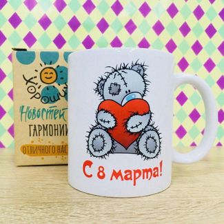 - Кружка С 8 марта, мишка с сердцем, в коробке по выгодной цене 395 р. руб.;
