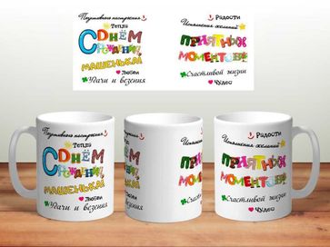 <p>Подарочная именная кружка с пожеланиями ко дню рождения.</p> <p>Кружка керамическая. Объем 300мл. Высота - 95мм, диаметр - 82 мм.</p> <p>Цена указана за белую кружку с белой ручкой. При выборе цвета будет цветная ручка и цветная внутренность кружки.</p> Предоплата при самовывозе Возможен самовывоз. Есть доставка.