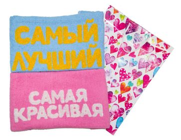 <p>Парные полотенца для влюбленных с надписями: "Самый лучший" для любимого парня и "Самая красивая" для любимой девушки.</p> <p>Романтичный подарок для второй половинки на 14 февраля.</p> <p>Размер полотенца 100*50см</p> <p>В наборе: 2 полотенца и пакетик с сердечками.</p> <p><strong>Внимание! </strong>Цвета полотенец могут отличаться от изображенных на фото. Полотенце для мужчины темных тонов, полотенце для девушки светлых тонов.</p> Наличные, безнал., карты, эл. деньги, юр. лица Возможен самовывоз. Есть доставка.