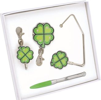 <p>Оригинальный набор с изображением четырехлистного клевера принесет удачу и станет приятным подарком для милых дам.</p> <p>Набор состоит из удобной шариковой ручки, складного и обычного крючка для сумки, крючка для ключей.<br /><br />Цвет: зеленый,серебристый<br /><br />Размер товара: 180 x 170 x 25мм<br /><br />Материал товара: металл</p> Наличные, безнал., карты, эл. деньги, юр. лица Возможен самовывоз. Есть доставка.