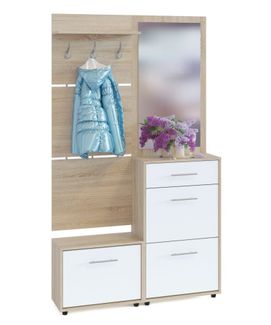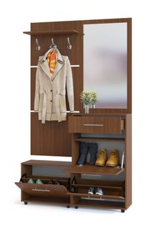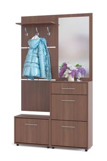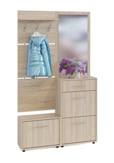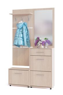Вместительная прихожая, состоящая из двух тумб для обуви, вешалки и зеркальной панели. Двери тумбы оснащены откидывающимся механизмом со специальными полками, которые обеспечивают удобство хранения и легкий доступ к обуви. Изготовлена из высококачественной ДСП 16 мм. Отделывается кромкой ПВХ 0.4 мм. Цвет перегородок в тумбе для обуви отличается от представленного на фотографии. Перегородки выполняются в белом и сером цветах.