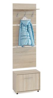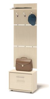 Вешалка состоит из 3-х панелей соединенных металлическими вставками. Полка, закрепленная над крючками для одежды, предназначена для головных уборов и зонтов. Максимальная нагрузка на полку составляет 5 кг. Компактная тумба для обуви, шириной 600 мм. Дверь оснащена откидывающимся механизмом со специальными полками, которые обеспечивают удобство хранения и легкий доступ к обуви. Изготовлена из высококачественной ДСП 16 мм. Отделывается кромкой ПВХ 0.4 мм.