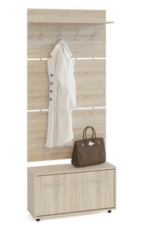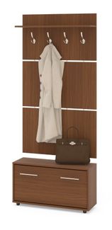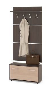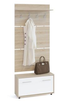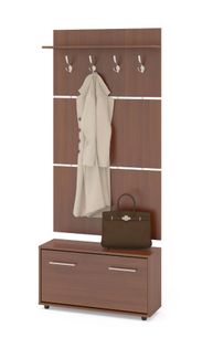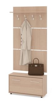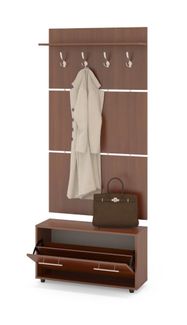 Вешалка состоит из 3-х панелей соединенных металлическими вставками. На верхней панели есть четыре 3-хрожковых крючка для одежды. Полка, закрепленная над крючками, предназначена для головных уборов и зонтов. Максимальная нагрузка на полку составляет 5кг. Широкая низкая тумба для обуви — 482 х 900 х 287 мм. Дверь оснащена откидывающимся механизмом со специальными полками для размещения обуви, которая обеспечивает удобство хранения и легкий доступ к обуви. Прихожая изготовлена из высококачественной ДСП 16мм, края отделаны кромкой ПВХ 0.4 мм.