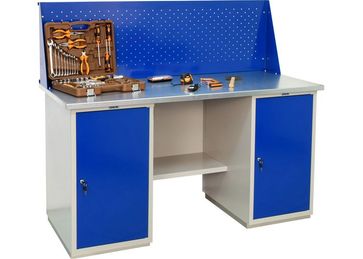 Верстак двутумбовый комплект: Столешница WT-160: МДФ 24мм + оцинкованный лист металла 1,5 мм (Габариты: 1600x26х700 мм), распределённая нагрузка на столешницу 300 кг. Две тумбы WD1: комплектуются 2-мя съемными регулируемыми полками (Габариты: 460х840х640 мм), нагрузка на полку 30 кг. Одна дверца, возможность смены стороны открывания двери, ключевой замок. Полка и стенка WSh-160/2 изготовлены из стали. Нагрузка на полку 40 кг. Дополнительно верстак можно укомплектовать перфорированным экраном соответствующего размера и аксессуарами для инструментов.