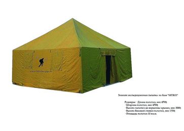 Палаткиизготовлены избрезентасо светопрочной комбинированной водоупорно-противогнилостной спецпропиткой. Каркас палаток представляет собой стальные трубчатые звенья, которые фиксируются переходниками. Утеплитель брезентовой зимней палатки изготавливается из байки суровой, отличительные черты которой хорошая теплоизоляция, низкая пожароопасность и гигроскопичность. Так же зимняя экспедиционная брезентовая палатка может укомплектоваться печью.