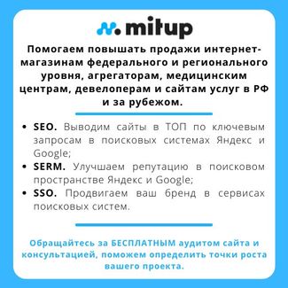 Mitup - это команда с высоким уровнем экспертизы в SEO, SSO и SERM.