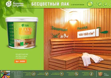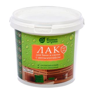 - Лак для бани и сауны с антисептиком Банные Штучки 09 кг бесцветный 34995 в каталоге Проектирование и строительство саун и бань в Москве;