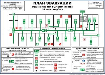 План эвакуации при пожаре - это схема помещений в зданиях где условными обозначениями указаны пути эвакуации людей при пожаре, аварийные выходы, места расположения противопожарного оборудования, аварийных телефонов, средств первой медицинской помощи и т.д. «Планы эвакуации при пожаре производятся по требованиям ГОСТ р 12.2.143-2009»