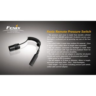 Оригинальная выносная кнопка от Fenix, витой шнур, включение без фиксации на цевье + кнопка с фиксацией на фонаре. Кнопка водонепроницаема по стандарту IPX-8 до 2м. При помощи этой выносной тактической кнопки можно включить фонарь для постоянного горения, нажав кнопку с фиксацией или включать фонарь при помощи удаленного включателя без фиксации на конце провода. Максимальная длина провода 70 см. Длина в сложенном состоянии 30 см. None