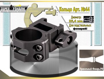 Быстросъёмное оружейное крепление (кольцо) "Артикул 44" предназначено для установки фонаря на стандартную планку Weaver/Picatinny шириной 21,2 - 22 мм. Кольцо Арт. №44 снабжено гайкой барашком, позволяющим устанавливать и снимать кольцо с фонарём при без использования специализированного инструмента, используя поворотный механизм. Быстросъёмное кольцо Арт. №44 фактически является аналогом кольца UTG (LEAPERS) RQ2D1204 с поворотный механизм Quick Detach twist lock. Кольцо предназначено для тактических (подствольных) фонарей различных производителей. Ключевое требование к фонарям - диаметр их корпуса должен быть равен 1 дюйму (25,4 мм). Фонарь в кольце фиксируется при помощи четырёх болтов, стягивающих две части крепления. Может использоваться с тактическими фонарями: