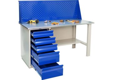 Верстак однотумбовый с ящиками комплект: Столешница WT-160: МДФ 24мм + оцинкованный лист металла 1,5 мм (Габариты: 1600x26х700 мм), распределённая нагрузка на столешницу 300 кг. Тумба WD5: состоит из 5-ти выдвижных ящиков. Телескопические направляющие. Нагрузка на ящик 30 кг. Центральный ключевой замок Практик. (Габариты: 460х840х640 мм). Полка и стенка WSh-160/1+ опора WF-1 изготовлены из стали. Нагрузка на полку 40 кг. Дополнительно верстак можно укомплектовать перфорированным экраном соответствующего размера и аксессуарами для инструментов.