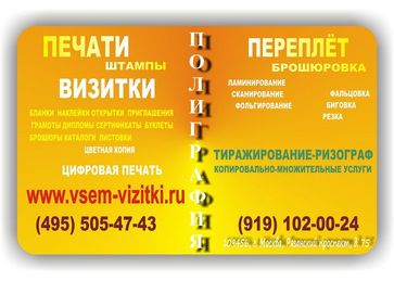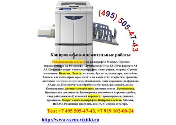 Переплетные работы * (495) 505-47-43 * СРОЧНО твердый (книжный) переплет дипломов, диссертаций, курсовых, книг и других документов * мягкий переплёт * брошюровка * Брошюровка на пластиковую и металлическую пружину * Типография * Визитки * календари карманные * конверты * открытки * бланки * брошюры * объявления * ведомости * буклеты * любая другая листовая и бланочная продукция Цифровая печать печать малыми тиражами * открытки * наклейки * календарики * приглашения * дипломы * грамоты * сканирование * Ламинирование * фольгирование * переплет * Печать * Цифровая печать * Тиражирование на ризографе не дорого Срочно * Послепечатная обработка: Фальцовка, Резка, Биговка * печати и штампы * восстановление печатей * Визитные карточки * Москва, ЮВАО, 15 метров от метро Рязанский проспет, 2-х этажное здание на 2-м этаже. Вход в магазин Сударь (495) 505-47-43, (925) 505-47-43, (919) 102-00-24 www.vsem-vizitki.ru