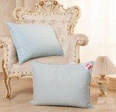 Пуховая подушка Нежная в традиционном исполнении из небесно голубого пуходержащего тика обеспечит Вам комфортную поддержку шеи и головы во время сна.