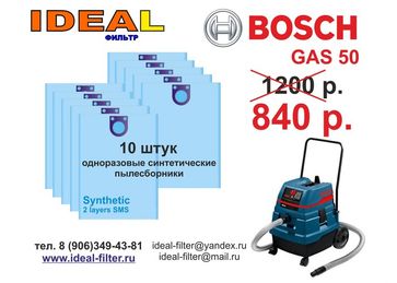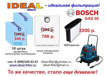 Многоразовый мешок для пылесоса BOSCH GAS 50 - 700 руб. за 1 шт.Одноразовые мешки для пылесоса BOSCH GAS 50 - 84 руб. за 1 шт.Кассетный фильтр для пылесоса BOSCH GAS 50 - 2200 руб. за 1 шт.Мембранный фильтр, щетки, насадки, шланги.А так же, для любых других пылесосов.