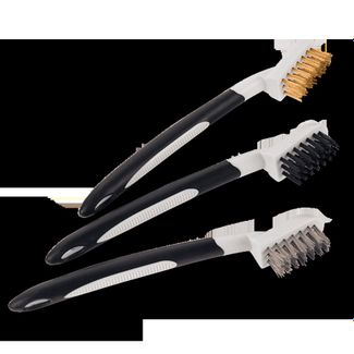 Удобные щетки для очистки двигателя, глушителя, металлических дисков и прочих поверхностей открытого незащащенного металла . Имеют эргономичную ручку, размер 17 см. Две щетки в наборе имеют медный ворс, одна- синтетический (может применяться для очистки резиновых патрубков). None