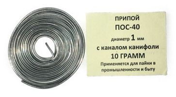 - Припой-спираль 10 гр. ПОС-40 д. 1 мм. с канифолью по выгодной цене 20 р. руб.;