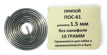 - Припой-спираль 10 гр. ПОС-61 д. 1.5 мм. без канифоли по выгодной цене 30 р. руб.;