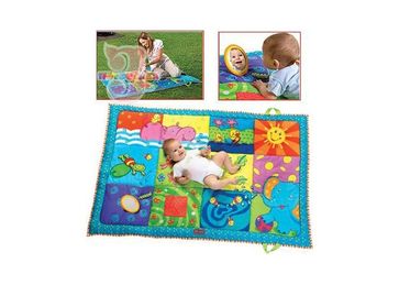 Развивающий интересный коврик для самых-самых маленьких 0—10 месяцев Этот удобный и большой коврик - отлично подойдет для путешествий и игр дома. Яркая картина-основа и много интересных "сюрпризиков" не оставит малыша равнодушным. Развивающий коврик типа TRAVEL "Самый большой". Это развивающий коврик сверх большого размера предназначен для пикников и парковых прогулок, также его можно использовать в домашних условиях. Коврик снабжен дополнительной мембранной прослойкой, предотвращающей попадание влаги, а специальная противогрибковая обработка предохранит малыша от паразитов. По всей поверхности коврика расположены разнообразные игровые элементы (прорезыватели, шуршалки, потайные кармашки, текстурные элементы и пр.). Отдельная интереснейшая деталь – зеркало (диаметр 15 см) с травмобезопасной зеркальной поверхностью (диаметр 12 см) – используется для независимой игры или пристегивается на тканевую петельку с «липучкой» на коврик. Коврик легко стирается, устойчив к воздействию органических элементов, морской соли и попаданию прямых солнечных лучей. Мелкие детали и разнофактурный материал игрушек способствуют развитию мелкой моторики пальчиков рук и тактильных ощущений у малыша. Размер коврика: 100х150 см.