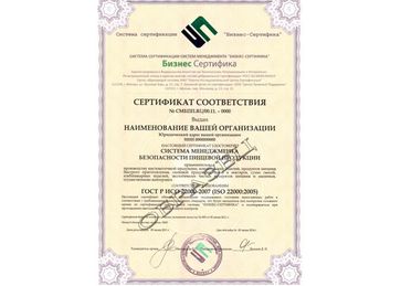 Национальный стандарт Российской Федерации сертификат ГОСТ Р ИСО 22000-2007 «Системы менеджмента безопасности пищевой продукции. Требования к организациям, участвующим в цепи создания пищевой продукции» идентичен международному стандартуISO 22000:2005