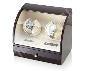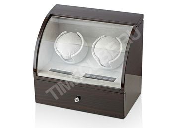 Шкатулка для двух часов с автоподзаводом. Материал: дерево венге, покрытое множественными слоями глянцевого лака. Внутренняя отделка: бархат светло-бежевого цвета. Электронное управление (LCD-дисплей). Крышка из органического стекла. Параметры подушечки для часов: