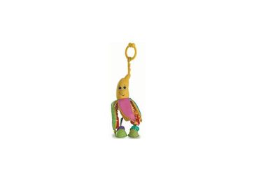 Пластмассовое кольцо погремушки позволяет легко и быстро прикрепить ее к дугам развивающего коврика или к дуге, установленной на кроватке малыша, на автокресло или прогулочную коляску. Ребенок рассматривает яркий банан, висящий над ним, трогает его, и получает первое представление о цвете, форме, материале. Ножки банана гремят, на каждой по два колечка, разные на ощупь. В стопах банана - два зеркальца. Ладошки сделаны в виде прорезывателей для зубов из мягкого безопасного пластика, а ручки растягиваются, если их потянуть. Игрушка развивает тактильные ощущения у малышей. Возраст: от 3 месяцев. Размер погремушки: 12х12х38h см. Рекомендуется ручная стирка.