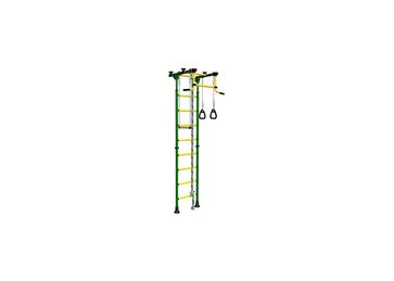 Тип: Г-образная гимнастическая стенка с мягкими обрезиненными перекладинами. Навесное оборудование: турник, канат, кольца, трапеция. Высота: 2,31 - 3,0 м. Занимаемая площадь: 0,74 х 0,86 м (по потолку), 0,55 х 0,05 м (по полу) . Монтаж: враспор между полом и потолком. Cуммарная нагрузка: до 100 кг. Габариты упаковки: 1 коробка: 110 х 40 х 14 см. Вес: 28 кг. Цвет: сине-желтый, зелено-желтый, красно-желтый.