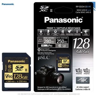 Карта памяти Panasonic 128GB UHS-II SDXC Memory Card. UHS Speed Class U3 Class 10 / V90. Чтение 280Мб/с / запись 250Мб/с (минимум 90МБ/с). Поддержка ALL-Intra 10-bit для LUMIX GH5. Запись 6K Anamorphic Video и 6K Photos, 4К фото и видео (4992 x 3744), DCI 4K (4096 x 2160), UHD 4K (3840 x 2160), anamorphic 4K (3328 x 2496). Защита класса 7 Smart Guard Protection. без предоплаты, нал, безнал с НДС, яд, сб онлайн Возможен самовывоз. Есть доставка.