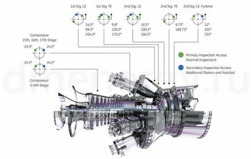 Целью Combustion Inspection является оценка состояния элементов камеры сгорания, а также тракта горячих газов, входакомпрессораилопаток компрессора. Инспекция осуществляется с использованием бороскопа (Boroscope Inspection), без разборкитурбины.