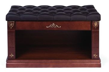 Массивный цоколь, пилястры по бокам с объемными декоративными элементами и фрезеровками относят эту модель к традиционному классическому стилю. Этому же служит стеганая подушка, декорированная экокожей. Под открывающейся подушкой расположен потайной ящик для различных мелочей.