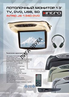 Технические характеристики монитора INTRO JS-1340: ЖК-панель 13.3" (1280x800); Формат экрана: 16:9; Видеостандарт PAL/NTSC/SECAM (автовыбор); Встроенный DVD-привод (MP4/DVD/VCD/CD; MP3/SVCD/JPEG/Kodak/CD-R/CD-RW); Встроенный ТВ-тюнер SECAM; Встроенная акустика; Игры, беспроводной игровой пульт; USB-порт, SD-кардридер; Встроенный FM-стереомодулятор; Встроенный ИК-передатчик для беспроводных наушников; Встроенный транскодер PAL/SECAM; Аудио/видео вход RCA; Аудио/видео выход RCA; Светодиодное освещение салона; Пульт дистанционного управления; Питание: DC 12 V; Цвет корпуса 3 в 1: серый / бежевый / черный. None Возможен самовывоз. Есть доставка.