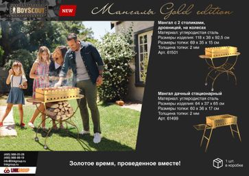 - Мангал на колесах Boyscout Gold с 2 столиками и дровницей 61501 в каталоге Решетки для гриля и барбекю в Москве;