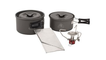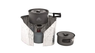 Система для приготовления пищи на 2-3 человек. В комплекте 2 котелка (1100 мл/ 1800 мл), 2 крышки, 1 горелка мощностью 3200 Вт, 1 ветрозащитный фольгированный экран и сетчатый None