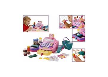 Электронная касса со сканером и ключиком для выдвижного ящика - на кассе есть сканер для считывания штрих-кода. Ребёнок подносит сканер к товару, нажимает кнопку – загорается «инфракрасный» индикатор и раздаётся щёлкающий звук. Теперь нужно посчитать сумму покупки – для этого касса оборудована самым настоящим калькулятором. Ребёнок нажимает на кнопочки, раздаётся пикающий звук, а на жидкокристаллическом дисплее кассы чётко видна пробитая сумма. Для наличных денег есть специальный ящичек. При нажатии на большую жёлтую кнопку раздаётся громкий звонок, совсем как на настоящей кассе, и ящичек выдвигается – можно принимать деньги за товар и выдавать сдачу, а можно закрыть ящичек с деньгами ключиком. Слева от кассы – транспортная лента с ограничителем для товаров, она управляется с помощью небольшого рычажка, продвигая товар к кассиру.