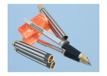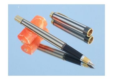 Элегантная ручка в металлическом корпусе с полосками. Идеально подходит для тех, кто любит компактные, но при этом увесистые инструменты. Длина этой ручки в колпачке 13,7мм, без колпачка - 11,9см, толщина - 1см. Вес в колпачке - 24гр, вес без колпачка - 14гр. Система заправки - пипетка, перо - сталь с иридиевым наконечником, F.
