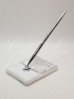 Ручка для свадьбы с подставкой Gilliann Silver Fairy Tale PEN024 Если предстоящий праздник бракосочетания уж не так далеко, а покупки еще не все состоялись, то стоит рассмотреть возможность приобретения свадебных коллекций полностью, чтобы сэкономить время, а часто еще и денег. Тогда приобретенные аксессуары будут полностью совпадать по стилю и цвету, в общем, будут смотреться нарядно и гармонично. Ручка для свадьбы с подставкой Gilliann Silver Fairy Tale PEN024 тому подтверждение. Она входит в коллекцию Silver Fairy Tale, но продается и как отдельная, самостоятельная единица. Изготовлена она из металла серебристого цвета, колпачок ее зафиксирован в подставке, которая входит в комплект. Подставка сделана из тисненого атласа, необычный, причудливый узор смотрится очень загадочно. Пышный бант со строгими геометрическими линиями изготовлен из трехслойного атласа, периметр подставки красиво отделан ажурной тесьмой. Данный свадебный комплект смотрится очень дорого, тут чувствуется определенный вкус, который присутствует у его обладателя. Такой свадебный атрибут с легкостью подойдет под классический, ретро, рустик, прованс и другие стили. Материалы и декор: дизайнерский атлас, атласные ленты, тесьма. <!--SPEC_HTML_EDITOR_SELECTION_START--><!--SPEC_HTML_EDITOR_SELECTION_END--> None