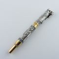 Серебряная шариковая ручка с барельефными изображениями и маленькой фигуркой медведя. None