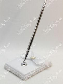 Свадебная ручка на подставке Gilliann Pearl White Bows PEN027 Практически все свадьбы, которые проходят с тамадой или без него, совершаются по одному сценарию – торжественная часть бракосочетания, катание молодых и праздничный банкет. Торжественная часть бракосочетания является самой главной, ведь именно в этой части рождается новая семья. Десятки глаз приглашенных гостей, оценивают каждый шаг, каждое действие молодых. Вот тут начинаешь понимать, что выбор свадебных аксессуаров стоит сделать основательно, тщательно взвесив все за и против. Свадебная ручка на подставке Gilliann Pearl White Bows PEN027 является эталоном хорошего вкуса. Белая, атласная ткань использована в качестве основы подставки, которая входит в комплект. По контуру подставка отделана ажурной тесьмой. Главным украшением комплекта считается декоративный бант с крупной жемчужиной (имитация), по контуру которой выложены небольшие стразы, они сверкают и переливаются в солнечных лучах. Данный свадебный аксессуар превосходно подойдет и для другой цели – заполнение книги пожеланий для молодоженов родственниками и друзьями. Материалы и декор: атлас, атласные ленты, тесьма, бусины, стразы, металл. None