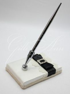 Свадебная ручка с подставкой Gilliann Night Magic PEN015 Изысканная ручка с подставкой ручной работы Gilliann Night Magic - красивое дополнение к подушечке для колец и папке для свидетельства о браке из коллекции черно-белых аксессуаров Gilliann Night Magic. Темная металлическая ручка с зауженным концом - эталон безупречного отточенного стиля. Подставка изготовлена из устойчивого основания, обтянутого атласом, украшена по краям декоративной тесьмой. Изюминка композиции - кружево в сочетании с черной атласной лентой, черным бантиком и квадратным декоративным элементом со сверкающими стразами. Элегантная ручка придется по душе молодоженам, отдающим предпочтение безупречной классике. Материалы: текстиль, кружево, атласная лента, декоративная тесьма, декоративный элемент со стразами, металл. Цвет: айвори (возможно бесплатное изменение на другой цвет) None