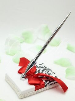 Свадебная ручка с подставкой Gilliann Red Rose PEN011 Ярко-красный атласный бант на подставке - словно символ пламенной любви молодоженов. Серебристая ручка гармонирует с витиеватыми черными узорами на белом атласе. Оригинальный стильный комплект Red Rose станет достойным украшением торжества. Материалы и декор: тесьма, атлас, атласные ленты. None